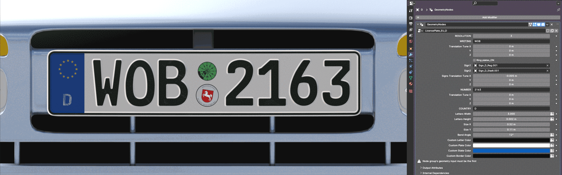 As an automotive CG artist, I always needed a simple setup for generating specific license plate numbers. While a displacement map with a PSD preset was my initial solution, it had limitations. So, here is a node preset that allows you to create the actual geometry of a license plate for any EU country with any number on it.